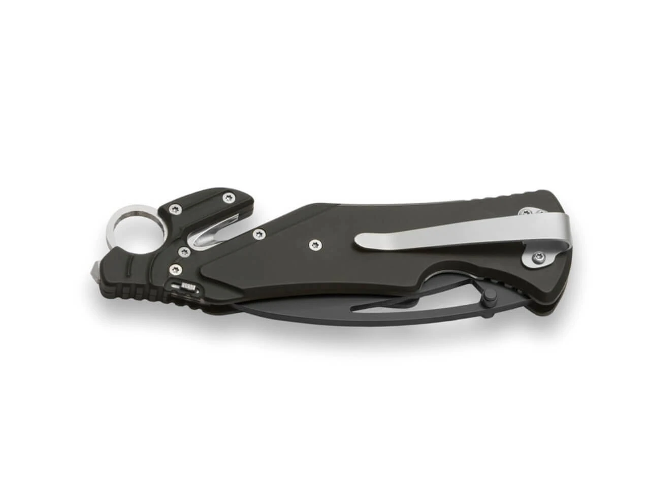 Die Hawkbillklinge ist aus D2 (58-60 HRC) gefertigt und mit einer korrosionshemmenden Beschichtung nach MilSpec-Standard versehen. Der aggressive Teilwellenschliff und die abgerundete Spitze sorgen für gefahrlose und hocheffektive Kappschnitte. Zusätzlich ist im Griffende ein Gurtschneider und ein Glasbrecher angebracht. Verriegelung per Linerlock. Schäkelöffner in der Hauptklinge. Der Bithalter, die große Fangriemenöse und ein abnehmbarer Clip ergänzen den Funktionsumfang.