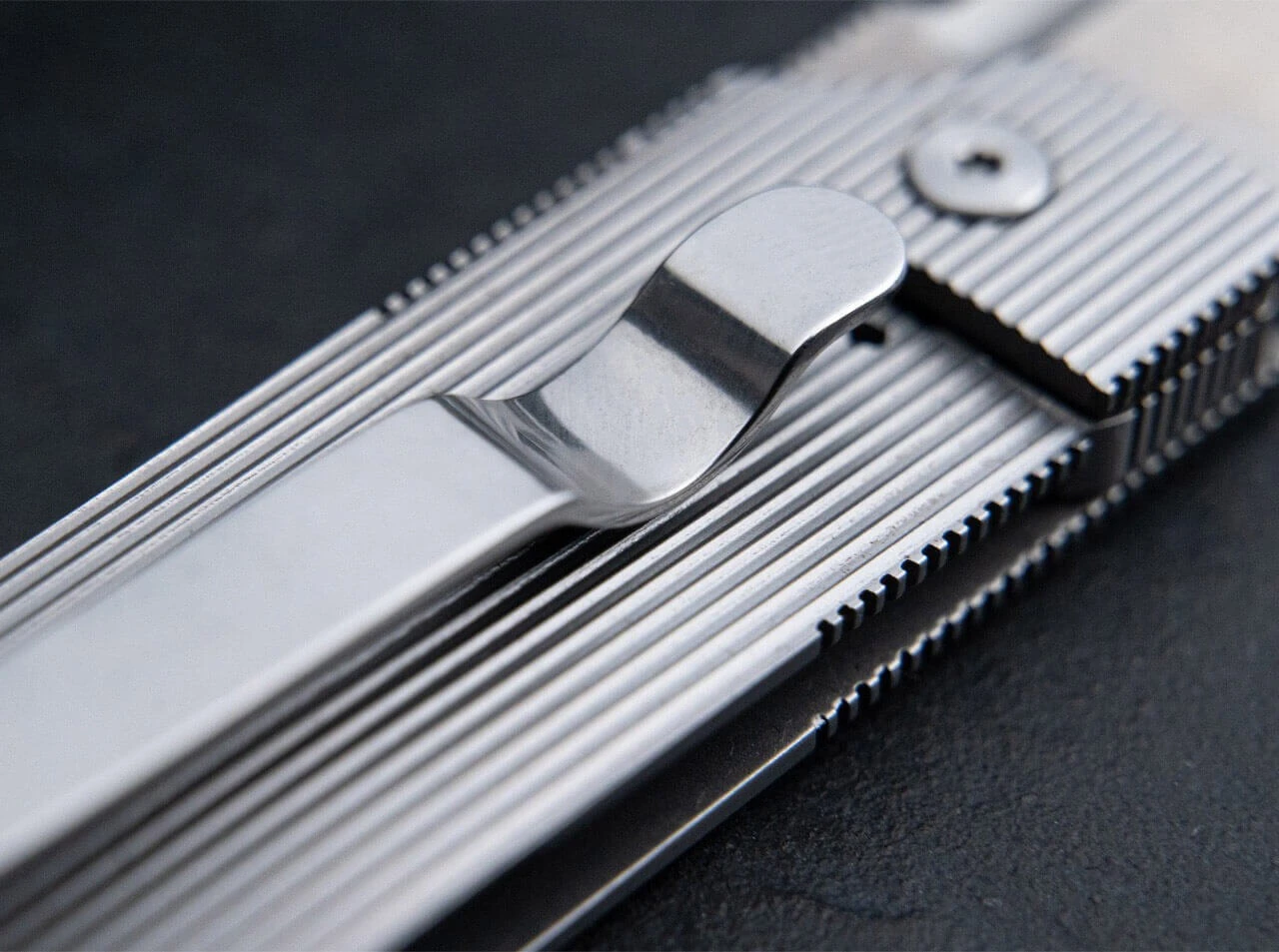 Markant, konsequent und zeitlos: das Böker Plus BabyX trägt die unverkennbare DNA von Darriel Caston als kompaktes EDC Messer im industriellen Wellblech-Look. Fernab üblicher Konventionen versieht der Designer das Taschenmesser mit eindrucksvollen Details, die unweigerlich für erhöhten Herzschlag bei zahllosen Messerfreunden sorgen. Die kugelgelagerte Sheepfoot-Klinge mit Satin Finish besteht aus dem besonders schnitthaltigen D2 Stahl und kann per Flipper geöffnet werden. Jimpings an Klingenrücken sowie Frontflipper erleichtern die Bedienung und sind neben der diskreten Fehlschärfe maßgebliche Designelemente, die im Edelstahlgriff nahtlos fortgeführt werden. Hier sorgen die in Längsrichtung platzierten Riffelungen für ein stimmiges Spannungsgefüge und garantieren sicheren Halt in allen Lagen. Der Frame Lock fügt sich fließend in die Liniensprache ein und komplettiert die gewohnte Böker Plus Performance. Als weiteres Highlight bildet der glänzende Deep-Carry-Clip (Tip-Up/r) einen harmonischen Kontrast zum ansonsten gedeckten Erscheinungsbild des Klappmessers. Praktisch: die Fangriemenöse erlaubt weitere Befestigungsoptionen.
