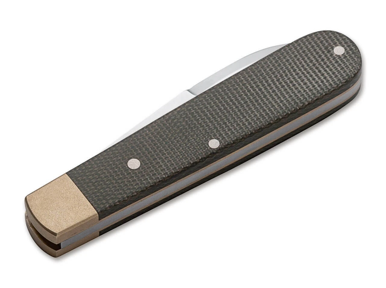 Das mit deutlich kürzer gestalteten Backen ausgestattete Böker Barlow Prime ist in dieser Version mit konturierten Griffschalen aus olivgrünem Canvas Micarta versehen, während Backen und Platinen aus matt gestrahltem Messing gefertigt werden. Der so entstehende farbliche Kontrast erinnert an die entbehrungsreichen Entdeckungs-Expeditionen längst vergangener Zeiten. Die satinierte Klinge wird aus eisgehärtetem N690 mit 60 bis 61 HRC gefertigt, zweihändig per Nagelhau geöffnet und verriegelt nicht. Sie ist mit einer modernen, langgezogenen Fehlschärfe versehen, die Bediensicherheit des Slipjoints wird durch einen 90°-Stop beim Öffnen und Schließen erhöht. Die charakteristische Tropfenform des Barlow lässt sich bis zu den englischen Taschenmessern des 17. Jahrhunderts zurückverfolgen, womit es sicherlich zu den ältesten Modellen überhaupt zählt. Handgefertigt in der Böker Messer-Manufaktur Solingen.