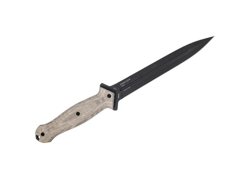 Das Steel Will Fervor wurde von tiefer Leidenschaft für das Mittelalter inspiriert und atmet den Geist eines historischen Dolches. Auf den ersten Blick strahlt dieser Nachfolger klassischer Formen Eleganz und Stärke aus. Die Stiletto-artige Klinge aus hochwertigem N690 Stahl ist beidseitig geschliffen. Sie ist mit einer Aspis-Beschichtung sowohl zum Schutz als auch zur Vermeidung unerwünschter Reflektionen überzogen, die dem offiziellen ML-DTL-13924 Militärstandard entspricht. Das Fervor 1201 hat einen hellen Micarta Griff, der einen herrlichen Kontrast zu seiner dunklen Klinge bildet.