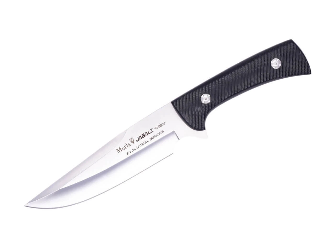 Die Evolution Series von Muela kombiniert traditionelle Werte mit modernen Ansätzen. Das Jabali-17M ist ein Jagdmesser mit hochfester Klinge aus X50CrMoV15, die mit einer ausgeprägten Fehlschärfe versehen ist. Als Griffmaterial kommen CNC gefräste Griffschalen aus schwarzem Micarta zum Einsatz, die dem feststehenden Messer einen angenehmen Halt in der Hand versprechen. Lieferung mit hochwertiger Lederscheide.