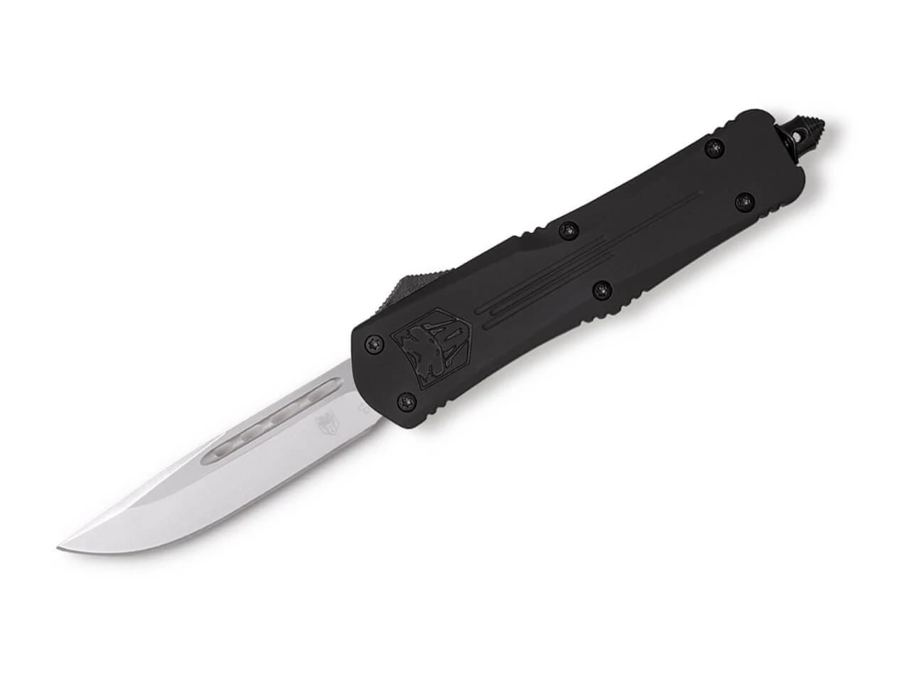 Die ausgewachsene Variante des beliebten FS-3 überzeugt mit einer soliden D2 Drop Point Klinge, die pfeilschnell per Knopfdruck aus dem vorderen Griffstück kommt und bei erneutem Betätigen wieder dort verschwindet. Das OTF Messer (Out The Front) ist mit einem texturierten Griff aus hochfestem Aluminium versehen, der in einem industriellen Grau gehalten ist. Der Deep-Carry Clip ist am Glasbrecher befestigt und erlaubt eine beidseitige Tip-Up Trageweise. Lieferung mit hochwertigem Nylon Etui.