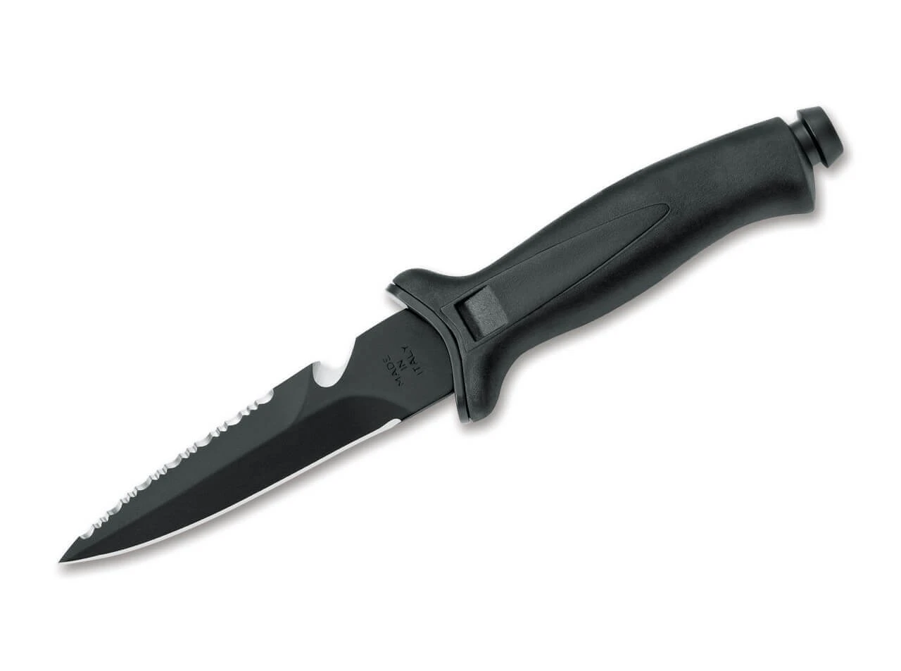 Das professionelle Tauchermesser Aquatys Stiletto 2 von MAC ist mit einer besonders spitzen, beschichteten Klinge aus 4116 ausgestattet. Zusätzlich verfügt die Klinge über einen bissigen Wellenschliff und einen Gurtschneider. Der schwarze Griff aus rutschfestem TPE liegt auch unter Wasser sicher in der Hand. Lieferung mit ABS-Scheide mit Gummibändern für Beine oder Arme.