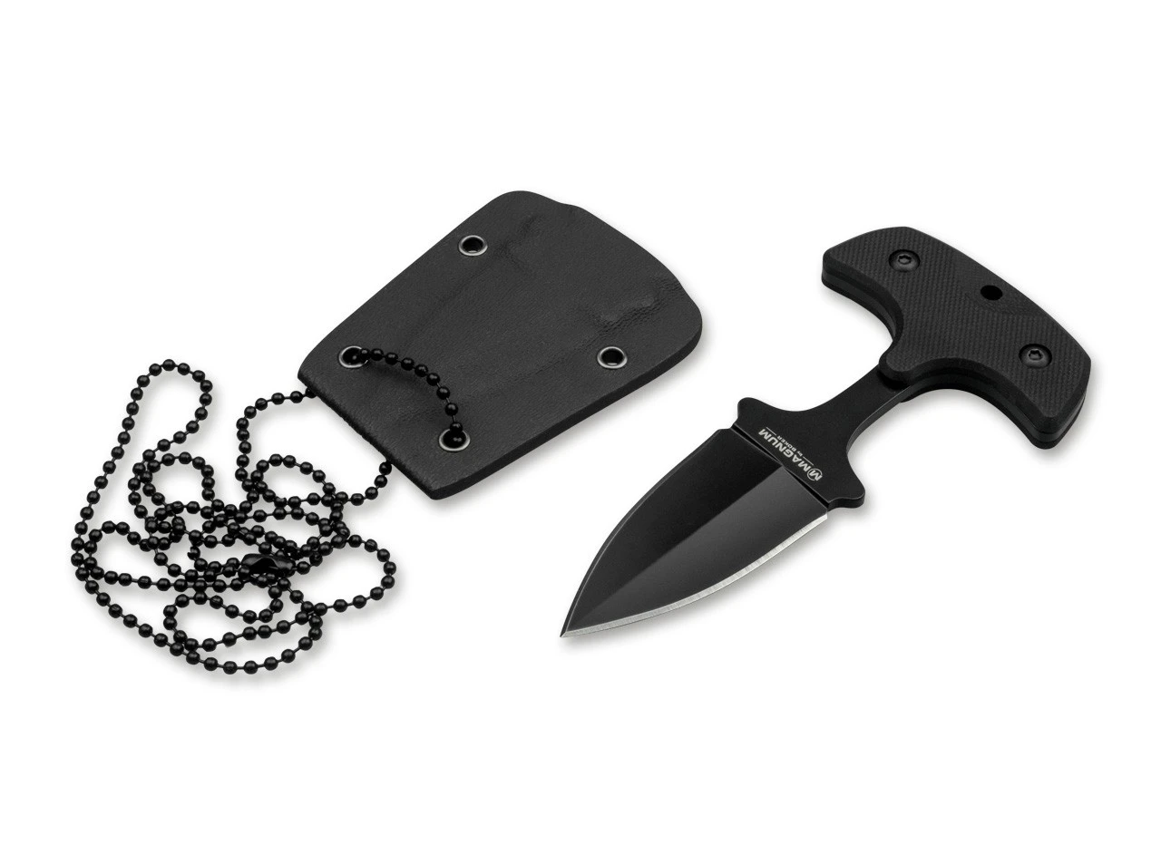 Der Magnum Push Dagger II ist mit einer dunklen, beidseitig abgezogenen Dolchklinge aus 440A ausgestattet. Die äußerst kompakte Kydexscheide erlaubt das sichere Tragen als Neck Knife oder auch lose in der Tasche. Der Faustdolch bietet eine breite Palette an Nutzungsmöglichkeiten an und verfügt dennoch über eine ausgezeichnete Ergonomie.
