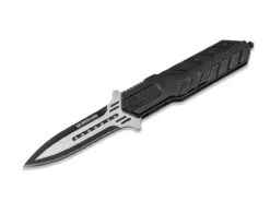 Das Böker Magnum Rocket startet durch und verlässt die Hemisphäre gewöhnlicher Taschenmesser mit seiner faszinierend gefrästen Two-Tone Klinge aus rostfreiem 440A Stahl, welche die Form einer Rakete aufgreift und tägliche Schneidarbeiten nahezu schwerelos erledigt. Der Flipper dient gleichzeitig als Handschutz, während der Liner Lock das Messer zuverlässig sichert. Einzig die rutschfesten Griffschalen aus texturiertem Aluminium sorgen für die nötige Bodenhaftung. Mit Glasbrecher und Tip-Up Clip (r).