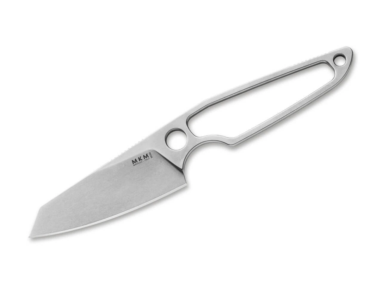 Die ausgewachsene Variante des beliebten MKM Mikro punktet mit einer Sheepfoot-Klinge aus Böhler M390 und wird von Designer Jesper Voxnaes ohne Griffschalen versehen. Das Skelettmesser trotzt mühelos schwierigen Schneidarbeiten und wird mit einer hochwertigen Lederscheide geliefert.