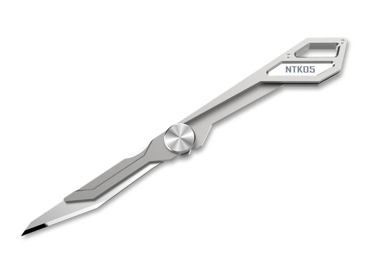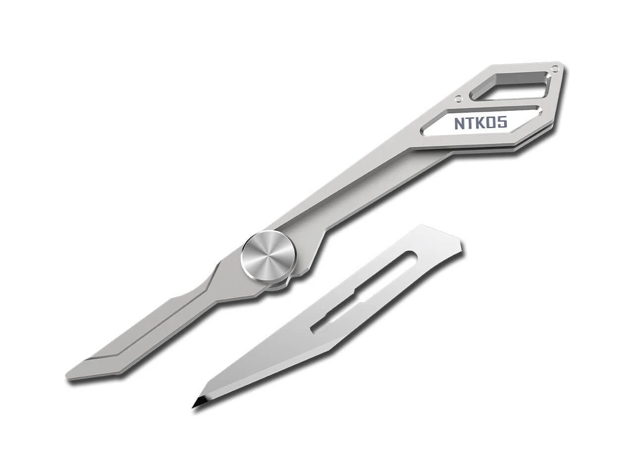 Mit dem NTK05 von Nitecore erscheint ein extrem leichtgewichtiges Messer für den Schlüsselbund. Der CNC-gefräste Griff besteht aus TC4-Titan und birgt die feine Skalpellklinge Typ 11. Sie zeichnet sich durch hervorragende Schärfe, Schnitthaltigkeit und Korrosionsbeständigkeit aus. Mit einem Gewicht von ungefähr fünf Gramm ist das Messer leichter als eine EC-Karte und damit ideal für den Schlüsselbund geeignet. Das Messer besteht nur aus sechs Einzelteilen und besticht mit einem schlichten und zeitlosen Design. Ersatzklingen vom Typ 11 sind überall im Handel erhältlich.