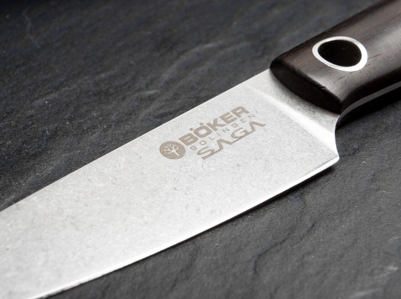Die sanft geschwungenen Griffe werden aus exklusiv zertifiziert importiertem Grenadillholz gefertigt. Mit seiner hohen Härte und Dichte ist Grenadill u.a. fest etabliert im europäischen Holzblasinstrumentenbau. Schon bei der ersten Kontaktaufnahme mit der Messerserie Böker Saga wird die gelungene Ergonomie deutlich: Jeder Bogen, jeder Schwung in der Linie schmiegt sich an seine Stelle in der Hand und vermittelt eine absolute Kontrolle und ein überragendes Schneiderlebnis. Das schwalbenschwanzartig verbreiterte Griffende der größeren Modelle bringt zusätzliche Griffsicherheit. Die hohe Stabilität verdankt Böker Saga dem komplett durchgehenden Erl, der das Messer (in der gleichen Bauweise wie viele Jagdmesser) von der Klingenspitze bis zum Griffende durchzieht. Für eine optimale Schneidleistung steht nicht nur der komplette Flachschliff der Klinge mit Stonewash-Finish, sondern auch die Wahl von 440C als Klingenstahl, der hinsichtlich Schnitthaltigkeit und Korrosionsbeständigkeit übliche Küchenmesserstähle weit übertrifft. Dieses in einem speziellen Schleifverfahren erzeugte Oberflächenfinish zeichnet sich durch hervorragende Gleiteigenschaften im Schnittgut aus und fördert so die ohnehin ausgezeichnete Schneidleistung. Des weiteren ist die Mikrostruktur des Stonewash-Finish extrem unempfindlich gegen Kratzer, da diese sich optisch in der Struktur oft verlieren..Den besonderen Akzent setzen die großen Hohlnieten, die unverkennbar die Handschrift von Jesper Voxnæs tragen.