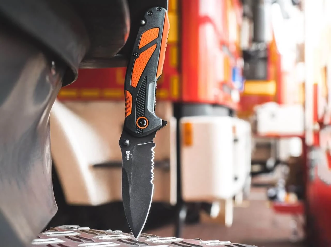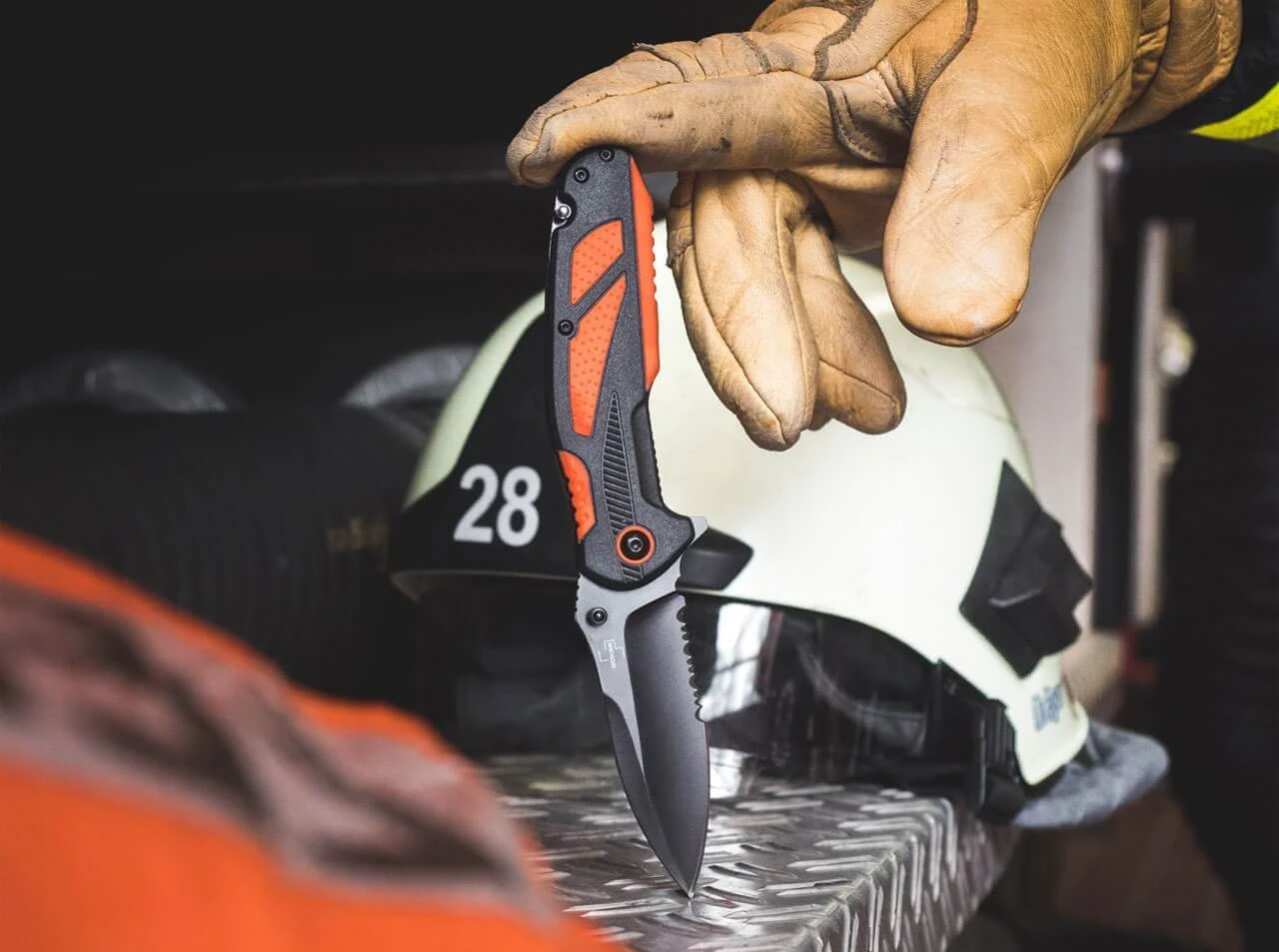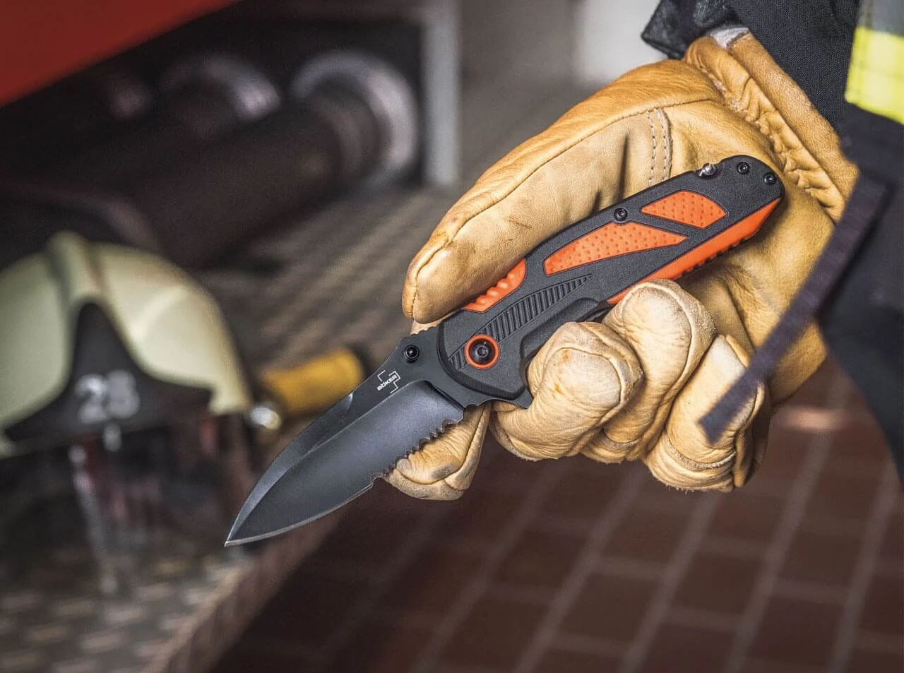 Das zuverlässige Böker Plus Savior 4 ist sowohl für den privaten Nutzer konzipiert, der sich für die Fremd- oder Eigenhilfe bei einem Unfall wappnen möchte, als auch für den professionellen Anwender, der das Messer dienstlich als Rettungswerkzeug führt. Solide Stahlplatinen tragen eine glasfaserverstärkte Kunststoffbeschalung, die an strategischen Stellen mit direkt aufgespritzten rutschfesten Gummieinlagen aus orangefarbenem TPR versehen sind. Dies gewährleistet ein sicheres Handling auch bei Nässe oder Kälte und in Stresssituationen. Der ausklappbare Gurtschneider ermöglicht das gefahrlose Kappen von Gurten auch nah am Körper. Die schwarz beschichtete Klinge des Linerlock Messers aus 12C27 öffnet per Flipper oder Daumenpin und ist mit einem praktischen Teilwellenschliff versehen. Mit hochwertigem Nylon-Gürteletui und Deep-Carry-Clip (Tip-down/r).
