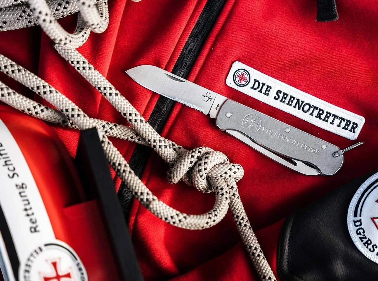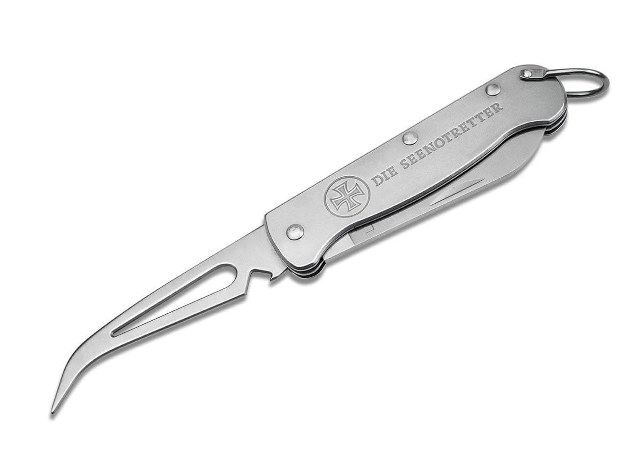 In enger Zusammenarbeit mit diesen Offshore-Profis haben wir das Böker Plus Seenotretter 1 entwickelt, das die hohen Anforderungen auf hoher See erfüllt. Als klassisches No-Nonsens-Takelmesser richtet es sich an professionelle und private Anwender auf maritimen- und Binnengewässern oder Menschen, die viel mit Tauen arbeiten. Es besteht vollständig aus rostfreiem Edelstahl. Die Hauptklinge aus 1.4116 ist mit einer halben Welle versehen, um verkrustete Taue und Gurte zu durchtrennen. Der Marlspieker (zum Aufstechen verhärteter Knoten) enthält zusätzlich Schäkel- und Flaschenöffner. Beide Klingen werden durch einen robusten und schmutzunempfindlichen Slip-Joint in Position gehalten. Für Haltbar- und Zuverlässigkeit wurde auf massive Domehead-Nieten anstelle von Schrauben gesetzt. Die vordere Schale ist mit dem bekannten Logo der Seenotretter mit Hansekreuz geprägt. Das Tragen wird durch einen Deep-Carry-Clip (Tip-Up/r) erleichtert. Vor Verlust schützt eine großzügig dimensionierte Reepschnuröse. Böker spendet 5€ vom Verkaufserlös jedes Messers an die Seenotretter der DGzRS.