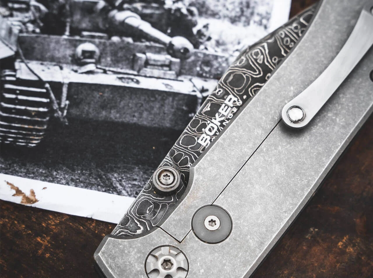 Das geradlinige Böker Tiger-Damast ist mit einer einzigartigen Damastklinge ausgestattet, die aus dem Stahl des bei Bauska zerstörten Kampfpanzers gefertigt wird. Der nicht rostfreie Mosaikdamast wird für uns von Hand von Chad Nichols im Muster Intrepid geschmiedet und erinnert an die Panzerspuren, die von den schweren Ketten des Tigers im Boden zurückbleiben. Anders als bei herkömmlichem Damast werden bei der Herstellung von Mosaikdamast keine Lagen erzeugt, sondern komplexe Damastbarren in einem aufwendigen und sehr komplizierten Prozess von Hand zu einem Mosaik verschmiedet.