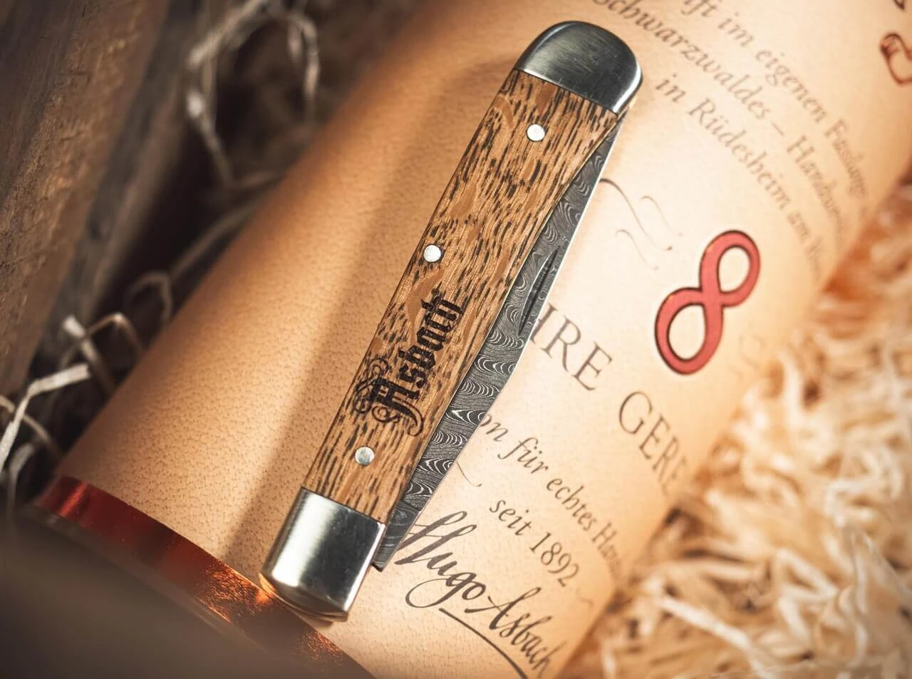 Das klassische Trapper ist seit dem Beginn des 20. Jahrhundert als vielseitiges Taschenmesser eine weit verbreitete Messerform und verdankt seinen Namen den amerikanischen Waldläufern, die als Jäger und Fallensteller Nordamerika durchstreiften. Sie gehörten zu den bedeutendsten Entdeckern und Wegbereitern der europäischen Besiedlung des Kontinents und waren oftmals die ersten, die Kontakte zu Indianern und Inuit aufnahmen. Ebenfalls um die Jahrhundertwende erfand Hugo Asbach in Rüdesheim am Rhein den deutschen Weinbrand, der als Asbach Uralt bis heute in aller Munde ist. Besonders wichtig für den charakteristischen Geschmack des edlen Weinbrands ist der aufwendige Reifeprozess, der sich in kleinen Eichenfässern aus mehrjährig abgelagertem Holz der Limousin-Eiche vollzieht. Ihr Holz ist besonders großporig und luftdurchlässig, sodass der Feinbrand im Austausch mit der Luft auf diese Weise atmen und reifen kann.
