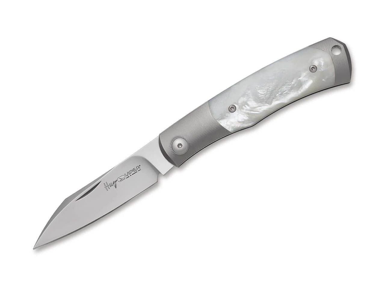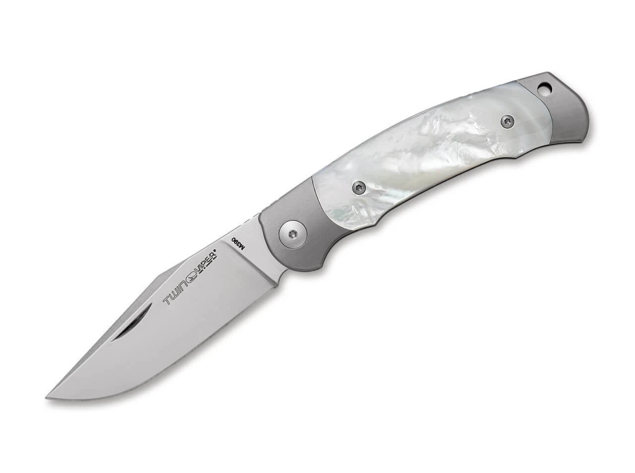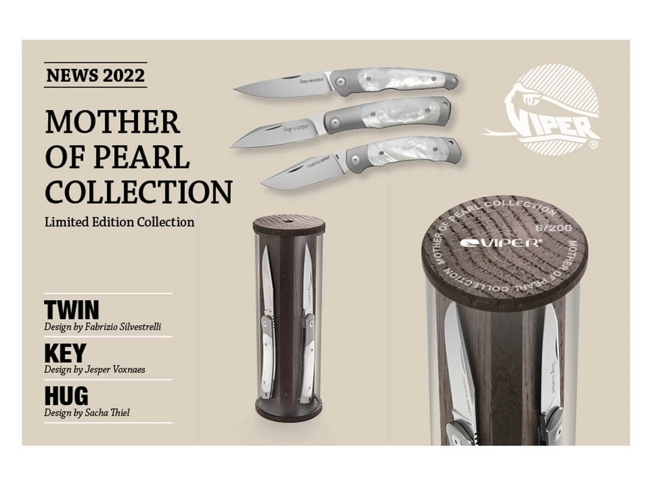 Diese weltweit auf 200 Stück streng limitierte Sonderedition enthält die drei beliebten Viper Slipjoint-Messer Twin, Key und Hug. Die Klingen aus M390 öffnen klassisch per Nagelhau und verriegeln nicht. Herzstück ist der Griff aus Titan, der mit Griffschalen aus Perlmutt versehen ist. Lieferung in edlem zylindrischen Messerhalter aus Holz mit Plexiglas-Front.