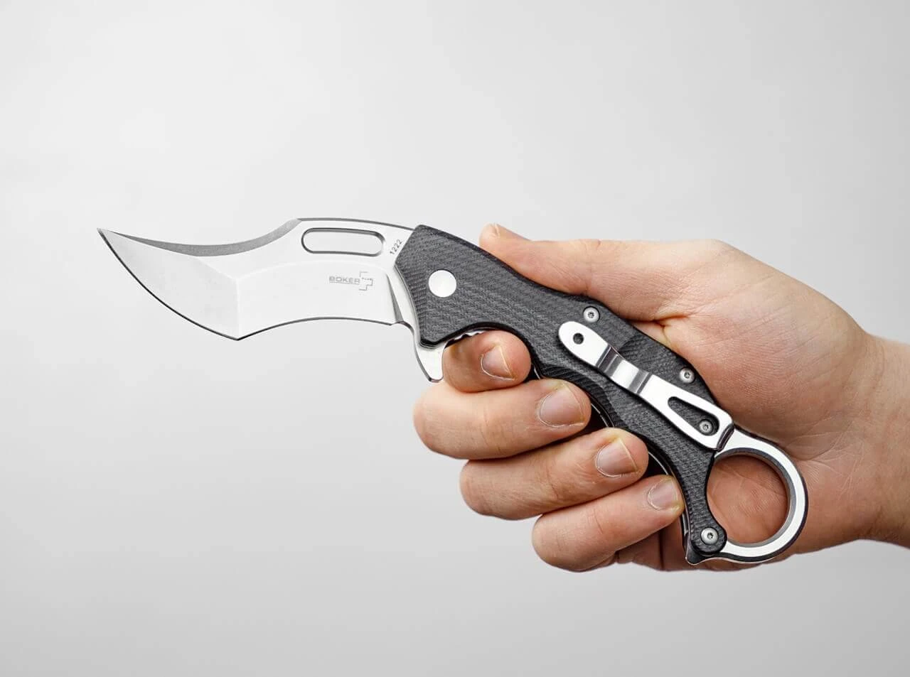 Die Entwürfe von Boris Manasherov überzeugen durchgehend durch ihre hohe Durchdachtheit, die perfekte Ergonomie und das ausdrucksstarke Design. Das überaus erfolgreiche Böker Plus Wildcat bekommt mit dem Wildcat XL einen großen Bruder zur Seite gestellt, der mit den gleichen Vorzügen punktet wie das Original, aber mit noch etwas mehr Handfestigkeit überzeugt. Für die kugelgelagerte Klinge kommt auch hier D2 zum Einsatz, während die Beschalung aus G10 besteht. Die Verriegelung erfolgt per Linerlock. Das Kerambit überzeugt mit perfekter Handlage, und die Klinge öffnet wahlweise weich per Daumenloch, oder schnell und nachdrücklich per Flipper. Der umsetzbare Clip (l/r) sorgt für einen tiefen Sitz in der Tasche, der den Ring jedoch oberhalb des Taschensaumes für ein schnelles Ziehen zugänglich lässt.