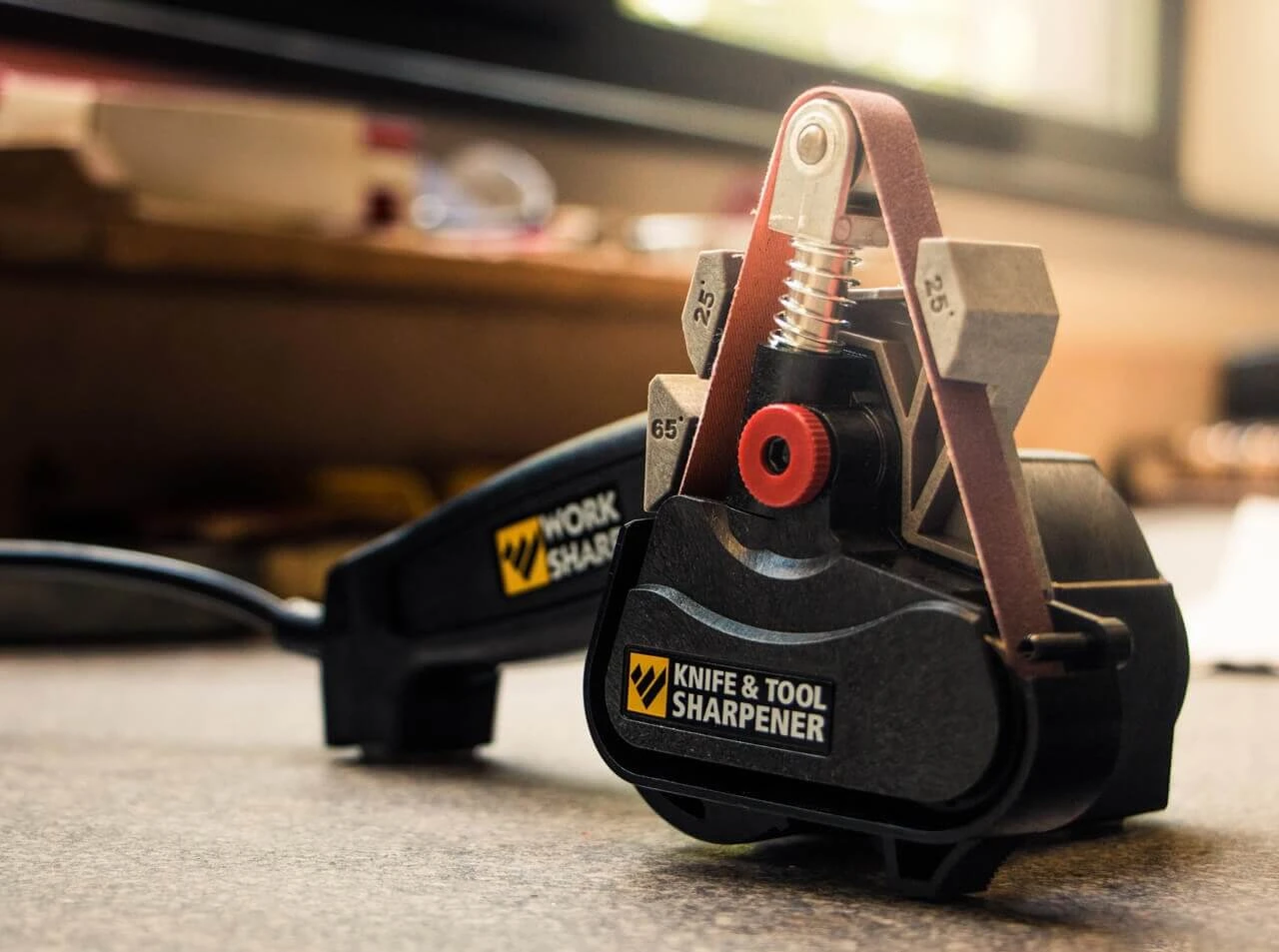 Der Knife & Tool Sharpener von Work Sharp aus den USA vereint die Vorzüge verschiedener Schärfsysteme in einem kompakten Gerät: Die Professionalität des Schärfens per Bandschleifer, wie es von vielen professionellen Messermachern praktiziert wird, und den Komfort sowie die Geschwindigkeit eines elektrischen Schärfgerätes, für alle, denen das Schärfen von Hand auf einem Schleifstein zu langwierig ist und die dennoch großen Wert auf ein feines, professionelles Ergebnis legen.